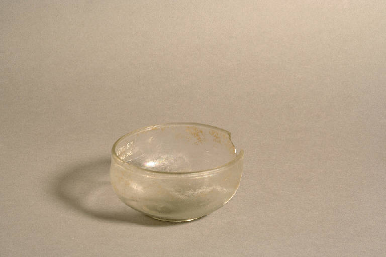 Orlo leggermente modanato, pareti diritte, fondo tondeggiante, piede ad anello appena accennato, deformazioni sulle pareti