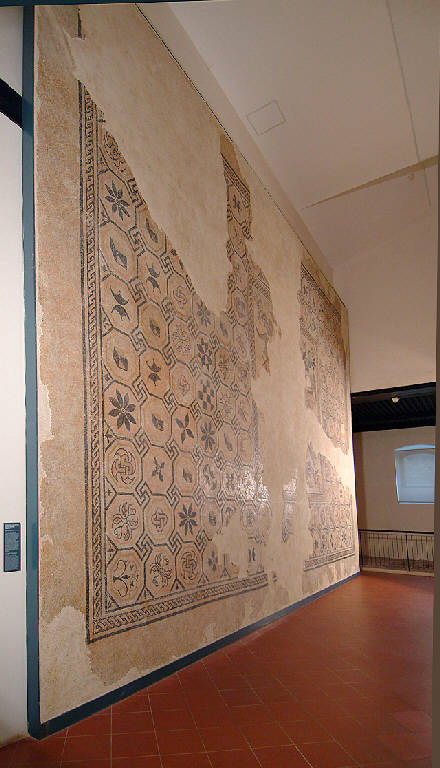 Frammento di mosaico pavimentale geometrico a ottagoni che racchiudono motivi decorativi fitomorfi e figurati, e pannello figurato centrale lacunoso, con tema di ambito marino e fluviale riferibile ad alcuni episodi della commedia teatrale "Rudens" di Plauto