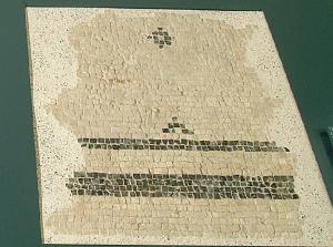Frammento di mosaico con fondo a tessere bianche e crocette nere