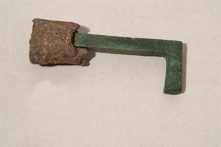Cilindro cavo in piombo in cui è inserita una barra a L in bronzo, a sezione quadrangolare