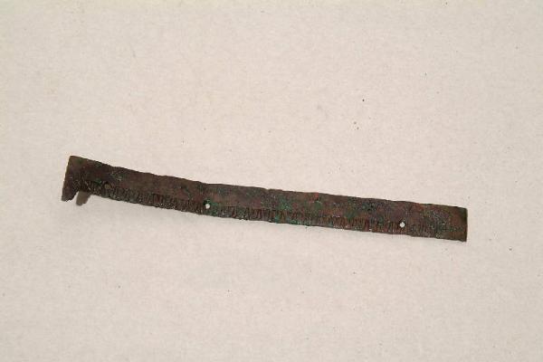 Frammento di cornicetta ad estremità angolare con decorazione a kyma naturalistico e tre fori per il fissaggio