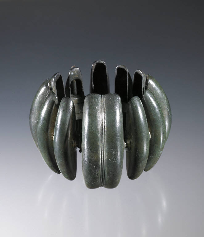 Formata da dodici ovoli cavi allungati, uno dei quali è doppio, chiusura ad incastro con perno che attraversa un ovolo in tutta la sua lunghezza.