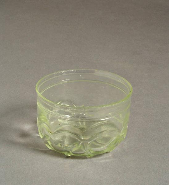 vetro giallo-verde/ soffiatura entro stampo/ molatura/ decorazione applicata a caldo