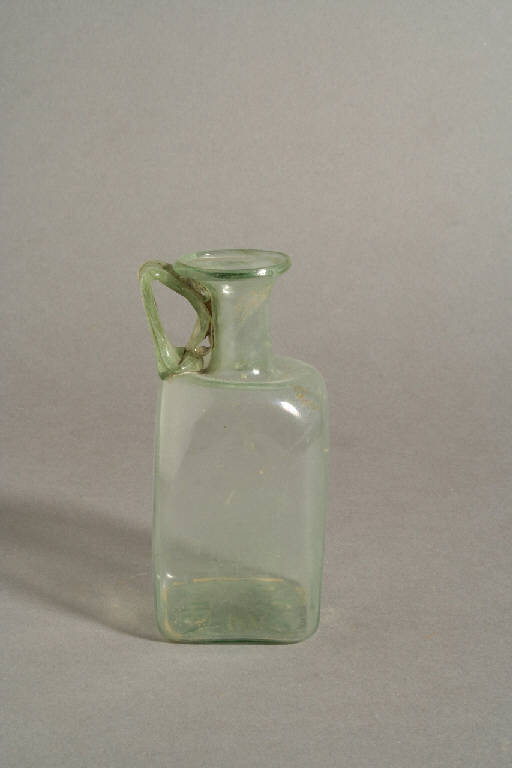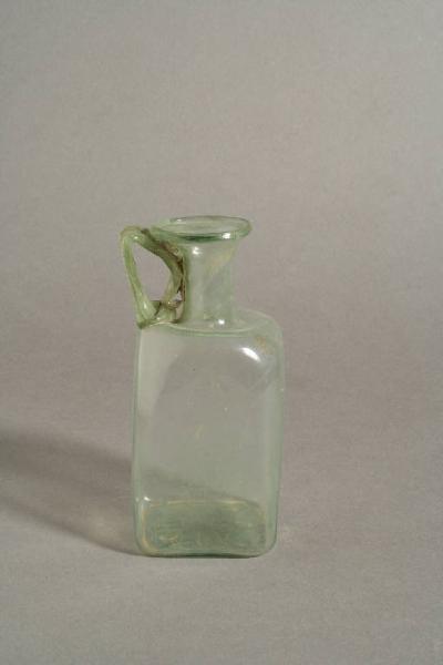Orlo a cordoncino ripiegato, corto collo cilindrico, ventre cubico su base leggermente concava, ansa a nastro impostata sulla spalla, piegata ad angolo acuto e saldata con un ricciolo sotto l'orlo. Decorazione: stella a rilevo sotto la base