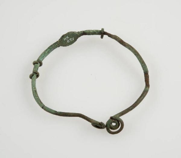 Verga a sezione circolare con estremità desinenti a spirale, a metà della circonferenza presenta una piastrina ellissoidale, lungo la corda sono infilati tre anellini con verga a sezione circolare. Decorazione: stella a otto punte con bottone centrale incisa sulla piastrina elissoidale
