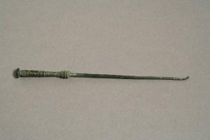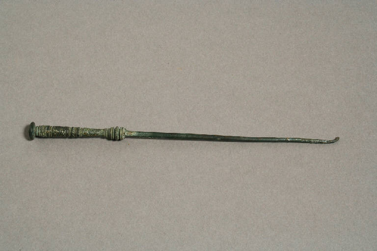 Manico a sezione circolare desinente a bottone, lama a sezione quadrangolare terminante ad uncino. Decorazione: incisioni formanti una rete sul manico