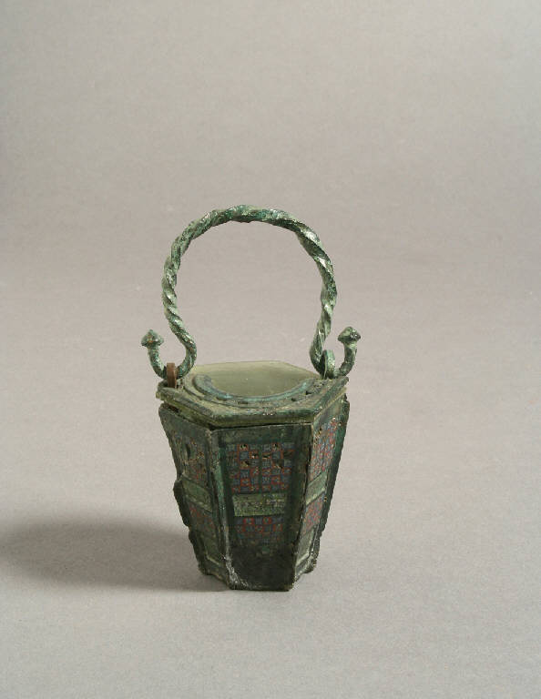 Orlo arrotondato, spalla orizzontale, corpo tronco piramidale rovesciato, base piatta; ogni lato è costituito da una lamina saldata suddivisa in quattro zone sovrapposte, decorate a riquadri in smalto rosso, azzurro, bianco; dotata di un manico semicircolare a torciglione terminante con due apici a bottone e saldato al corpo tramite due anelli