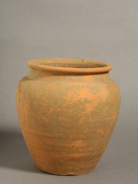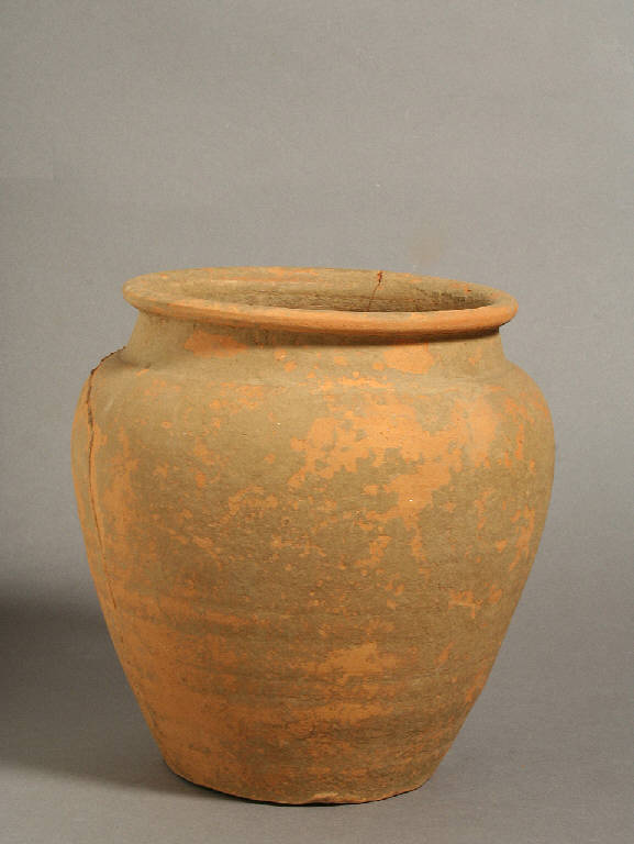 Olla con labbro ingrossato a cordone ed estroflesso, gola alta e segnata, il copro ovoidale, con fondo piatto