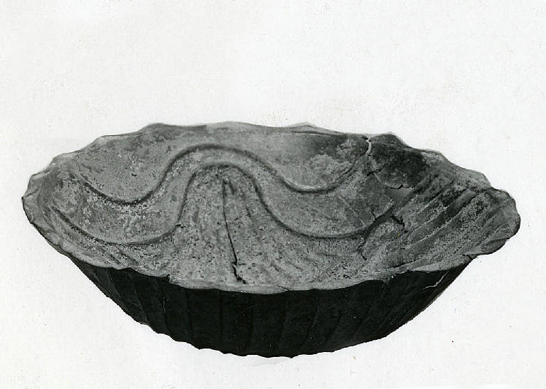 Orlo estroflesso appiattito ed ondulato. Decorazione a sbalzo imitante sia all'esterno che all'interno la valva di una conchiglia; sul fondo interno tre cerchi concentrici incisi