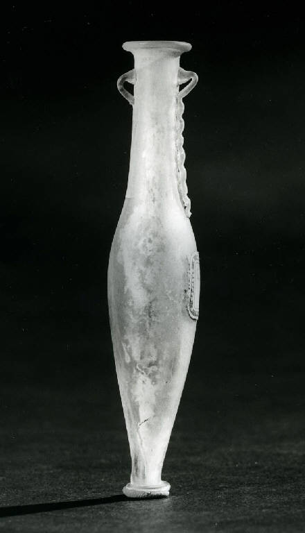 - NOTIZIE STORICO CRITICHE ""Due tombe romane scoperte nel 1903 nello stabilimento Franchi - Griffin. Il mobiglio funerario fu dalla Ditta donato al Museo"(1912, Rizzini Prospero, II, 18 - 19).""Questi quattro oggetti vennero trovati in una tomba romana scoperta a Sant'Eustacchio, nella fonderia di proprietà dei donatori, orientata con la testa a ponente, i piedi a levante, profonda m 1,12, costrutta con embrici"(2 aprile 1903, Registro Ingressi, 149).""Il 1 aprile 1903, la Società Metallurgica Italiana Franchi Griffin, nel fare eseguire uno scavo per fondamento di muratura sotto la tettoia dei torni di ferro, situata a trenta passi a nordo della via che da Sant'Eustacchio mette al ponte delle Grotte sul Mella, alla profondità di metri 1,12, in un terreno di importazione, si misero alla luce due tombe dell'epoca imperiale romana, parallele e poco discoste tra di loro, costruite con embrici e tegoloni di argilla rossa, purgata e ben cotta e delle solite dimensioni usate in quei tempi. Gli embrici disposti in piano alla base, verticali ai fianchi, a piovente sulle pareti coperte alla sommità dai tegoloni, rendevano le tombe di forma prismatica, le quali orientate con la testa a ponente, i piedi a levante, per la loro angustia, e per la piccolezza delle ossa contenute, lasciavano supporre che il defunto tumulato fosse molto giovane"(Archivio Museo Cartella V)).