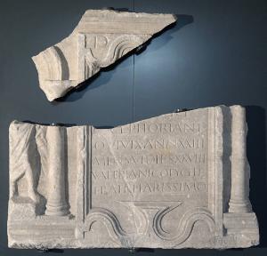 Due frammenti pertinenti alla fronte di un sarcofago: sulla sinistra figura di togato stante e colonna dalla doppia base, che si ripete sulla destra inquadrando una tabella con cornice mistilinea che reca l'iscrizione dedicatoria