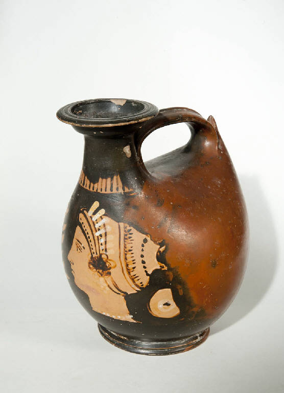Piede a disco modanato, corpo globoso, allungato nella parte posteriore, dove si alza a formare un apice, a cui si attacca l'ansa a cestello. L'ansa è a nastro con costolatura centrale. Sul davanti si modella invece in un sottile collo cilindrico, da cui nasce l'imboccatura troncoconica, più larga del collo. Questo è a labbro espanso verso l'esterno