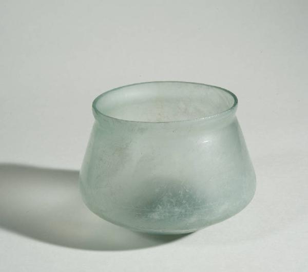Corpo tronco-conico, rastremato verso l'alto, fondo tondeggiante. Una leggera strozzatura sotto l'orlo, tagliato a spigolo vivo, forma un colletto attorno alla bocca.