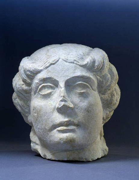 Testa femminile di ambito funerario dall'ovale massiccio, zigomi e mascella marcata, mento prominente. Le labbra sono pronunciate, quello inferiore crea una leggera fossetta col mento. Gli occhi sono grandi, ovali, con la sclera non incisa, le palpebre a cordoncino. Marcate le arcate sopraciliari. La capigliatura, con scriminatura centrale, viene raccolta in ciocche tubolari ai lati della testa, formando uno spazio triangolare sulla fronte. Si percepisce la presenza di due ciocche che scendono lungo il collo. La parte retrostante non è scolpita.
