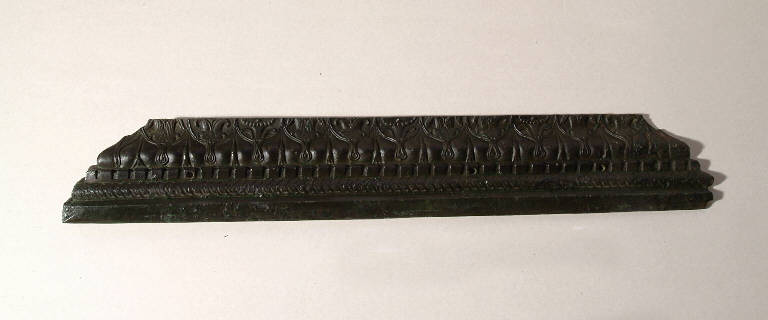 Cornice modanata in bronzo con, dal basso, motivo a treccia, fila\ndi perline, baccellature, doppia fila di foglie lisce,\nkyma lesbio trilobato con palmette intermedie, fila di\nperline, astragalo a perline e fusarole