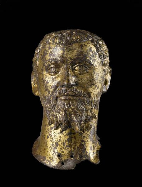 Testa ritratto virile con superficie interamente dorata. La fronte è solcata da due rughe e incorniciata da piccole ciocche che si dispongono in alto e sulle tempie. Gli occhi sono ovali, con pupilla incisa e iride incava; anche le sopracciglia sono incise e l'arcata leggermente in rilievo. Il naso è dritto e regolare; la bocca sottile, con il labbro superiore coperto dai baffi che si congiungono alla barba. Questa copre la mascella e sul mento si allunga in due corni. L'ovale del viso, piuttosto tondeggiante, si imposta su un collo massiccio.