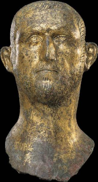 Testa ritratto maschile dall'ovale tondeggiante, con la barba e i baffi solo incisi, privi si volume; anche la massa di capelli si solleva di poco dalla calotta cranica e le ciocche sono incise. La fronte è alta; le arcate sopraccigliari incise, come anche gli occhi, irregolari nella forma, con pupilla e iride incise sulla sclera. Le labbra sono sottilissime e separate da una solcatura.