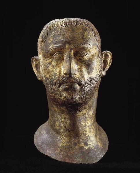 Testa ritratto maschile con ovale massiccio. La barba è composta da piccole ciocche, scolpite a scalpello dopo la fusione, così come i capelli sulla fronte, che si dispongono in alto e sulle tempie. La fronte è solcata da due rughe. Incise a freddo anche le sopracciglia. Gli occhi sono piccoli, a mandorla, ma leggermente differenti tra loro, con quello sinistro più piccolo. Il naso è dritto e il setto nasale sottile. Leggermente distaccate dalla testa sono le orecchie. La forma arrotondata del bordo del collo indica che la testa doveva essere collocata su una statua panneggiata.