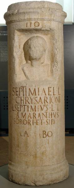 Ara circolare con base e cornice modanata. In una nicchia rettangolare è inserito il ritratto della defunta su busto trapezoidale. La capigliatura è raccolta ai lati di una scriminatura centrale, con due ciocche che cadono dietro le orecchie.
