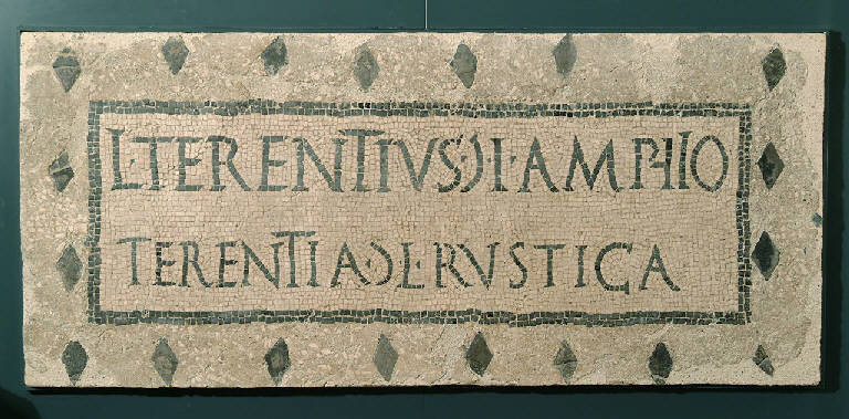 Porzione di tessellato bianco con riquadro centrale bordato di due file di tessere nere entro cui si dispone il titolo sepolcrale su due righe. Esternamente una decorazione a rombi (4x7) realizzati in opus sectile