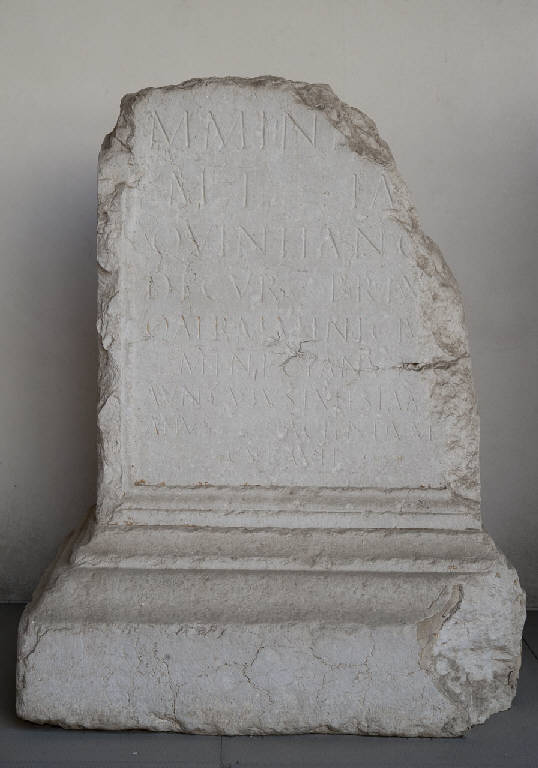 Monumento funerario ad ara con base modanata su plinto. Il lato anteriore e i fianchi sono caratterizzati da una bordura modanata, mentre il retro è liscio.