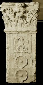Monumento costituito da pilastro e capitello corinzio. Il pilastro presenta una composizione decorativa marginata lateralmente e superiormente da due listelli a superficie liscia. Il pilastro sostiene un capitello corinzio con un solo ordine di foglie d'acanto piuttosto piatte, scandite da leggere incisioni ed a profilo frastagliato. I cauli, piuttosto tozzi, ed ornati da due sepai, si concludono in una coroncina liscia. I caulicoli accompagnano elici e volute a canale piatto e schiacciate sotto l'abaco che presenta cavetto, filetto e pesante ovolo. Illeggibile il fiore dell'abaco ed il calice centrale da cui nasce lo stelo. Fra capitello e pilastro si trova un tondino a superficie liscia sovrapposta ad un sottile listello.\nL¿insegna raffigurata sul lato principale sembra verosimilmente alludere all¿attività del defunto che prestò servizio nell¿esercito romano in qualità forse di signifer della massima categoria, ovvero aquilifer, colui che, secondo solo al centurione, aveva la responsabilità di condurre l¿aquila