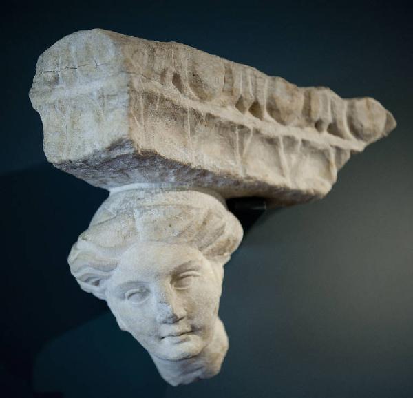 Frammento di uno spigolo di capitello figurato. Abaco bipartito: tondino decorato da kyma ionico e cavetto da baccellature. La parte figurata consta di una testa femminile classicheggiante: capelli con scriminatura centrale, ampia fronte, arcate sopracciliari appena inarcate, occhi leggermente infossati, sottolineati da spesse palpebre, naso diritto, labbra socchiuse, meno rotondo. La superficie non è levigata e si notano segni di scalpello. Il trapano si nota nel taglio della bocca.