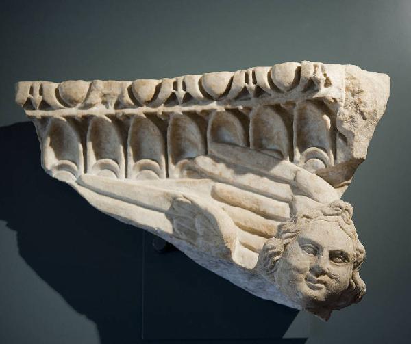 Frammento di capitello di lesena figurato. L'abaco risulta bipartito: il tondino superiore è decorato da un kyma ionico; il cavetto da un motivo a bacellature semilunate. Si osserva, inoltre, la figura di un Erote di cui sopravvive il volto, pieno, incorniciato da lunghe chiome che ricadono ai lati delle guance e sono raccolte sulla testa in un piccolo ciuffo. Le ali, di profilo, ricoprono in parte l'abaco. La superficie non è levigata. Si notano segni dello scalpello e l'uso del trapano è limitato agli ornati dell'abaco.