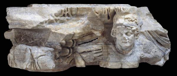 Frammento di capitello figurato di colonna. L'abaco è bipartito: il tondino è decorato da kyma ionico, il cavetto da baccellature. Si osserva anche una minima porzione del flos abaci a petali vegetalizzati. Superficie non levigata e uso del trapano limitato all'abaco, alle piume delle ali, alle pieghe della manica della tunica, al taglio della bocca del guerriero e alla capigliatura a boccoli e nell'elmo.