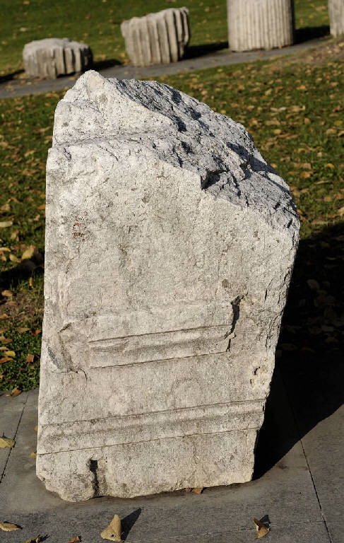 Blocco di architrave a due fasce separate da una gola rovescia. La metà superiore è liscia e destinata al fregio. Un fianco è obliquo, forse per l'inserimento del pezzo in un architrave del tipo a piattabanda.