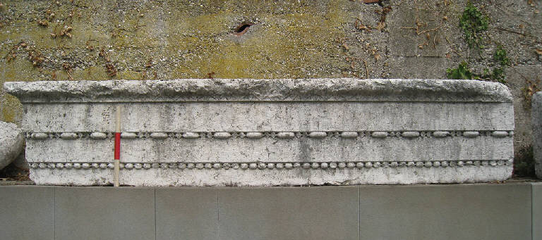 Blocco di architrave a tre fasce. Dall'alto: listello liscio alto 3 cm, gola rovescia con kyma lesbio, fascia liscia (alt. 11,5 cm), astragalo con perle allungate e fusarole tondeggianti, fascia liscia (alt. 9 cm), astragalo a perline, fascia liscia (alt. 6,5 cm). Sul piano di attesa si osserva un foro centrale per perno, con canalina di fusione, e a sinistra un altro foro per grappa. Il blocco è inoltre predisposto per l'inserimento in una struttura ad immorsatura: dal muro sarebbe sporta la parte anteriore su cui si estende la decorazione che prosegue sui lati per 10 cm circa.