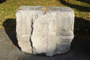 Blocco cruciforme di architrave e fregio. L'architrave è del tipo a tre fasce, separate da un tondino, rifinito in alto da una gola rovescia e un listello. La superficie del fregio è arretrata rispetto a quella dell'architrave e non è lisciata. I fianchi del blocco presentano superficie di anatirosi con fascia rettangolare centrale scabra e attorno liscia.