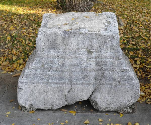 Base a modanatura liscia di ara funeraria parallelepipeda con tracce di iscrizione; la parte superiore è stata scavata per reimpiego
