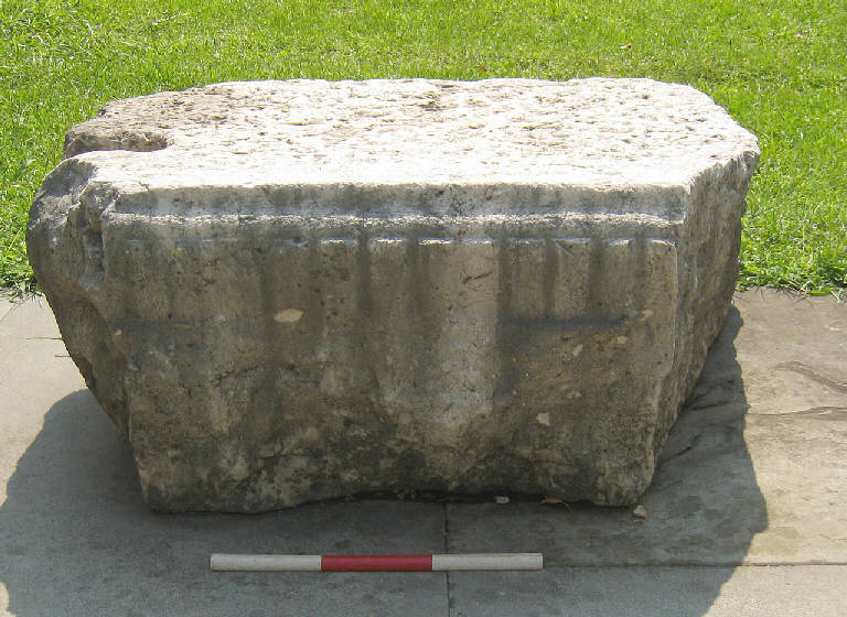 Del blocco di cornice è visibile la fronte modanata dove si osserva una gola rovescia alta 5 cm e una fascia di dentelli alti 8 cm e larghi 3,5. La restante parte è stata completamente asportata. La posizione attuale del blocco consente la visione del piano di posa dove è presente un riquadro di anatirosi con una fascia esterna (larg. 10 cm) verso i dentelli, più liscia e la faccia di giunzione solo grossolanamente lavorata con un foro con un incavo lungo 11,5 cm, largo 7,5 cm e prof. 7 cm.