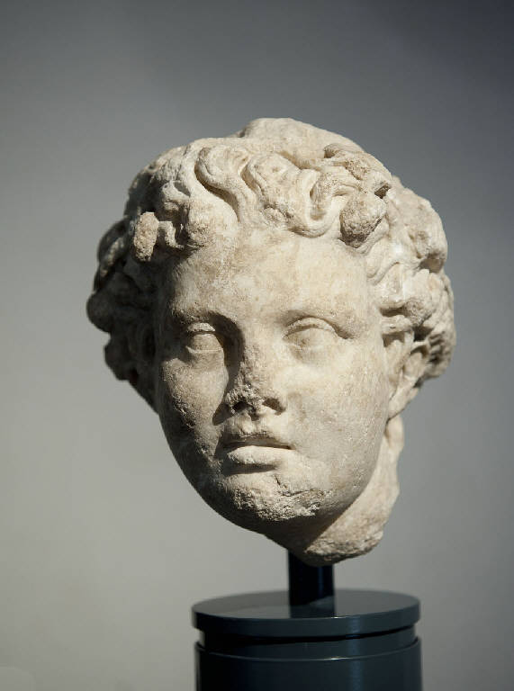 - NOTIZIE STORICO CRITICHE La presenza della corona suggerisce un'immediato richiamo alla sfera dionisiaca, e in effetti la testa in esame può trovare confronto in alcune celeberrime raffigurazioni di creature mitiche al seguito di Dioniso: malgrado l'assenza di orecchie ferine, sembra ad esempio possibile istituire un pur generico legame iconografico con il tipo del satiro giovane "in riposo", inaugurato dall'anapauomenos prassitelico e spesso ripreso o citato nella produzione scultorea di età romana, anche in scala ridotta. Notevole la presenza di cospicue tracce d'un attacco di ponteggio, forse destinato a sorreggere una mano della medesima figura, nella posa frequentemente adottata per l'iconografia di Dioniso; in alternativa nulla esclude comunque l'eventualità che il frammento appartenesse originariamente ad un gruppo, e debba quindi interpretarsi in rapporto e in diretta connessione con una o più figure