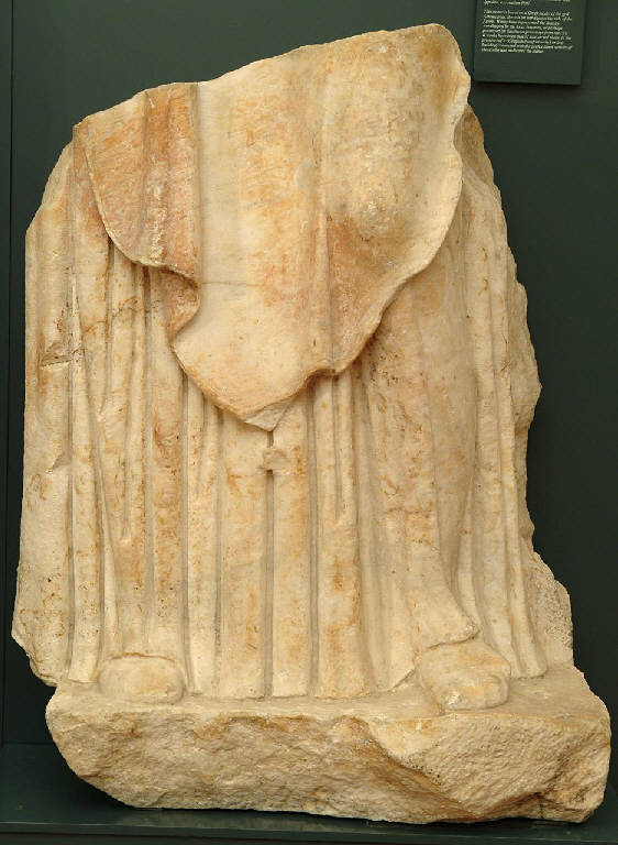 Porzione inferiore di una figura femminile rappresentata stante sulla gamba destra, con la sinistra lievemente flessa e avanzata. Sopra una lunga veste, le cui pieghe ricadono verticalmente fino a terra, è drappeggiato un più pesante mantello, eseguito in alto aggetto e caratterizzato da superfici ampie e distese; lungo il bordo corre un sottile solco inciso, mentre l'angolo ancora visibile mostra tracce di un fiocco, ora in parte abraso. Ai piedi sono calzari chiusi.\nSi nota un insistito uso del trapano per la resa delle pieghe che crea un effetto scultoreo duro e poco naturalistico. Il lavoro risulta piatto e di scarsa profondità.