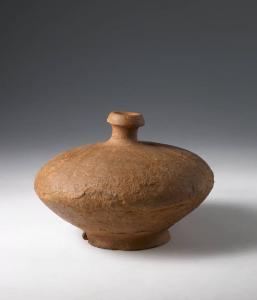 Alto orlo a fascetta con labbro pendulo esternamente, breve collo cilindrico svasato, corpo lenticolare, piede ad anello, fondo con accenno d'ombelico. Il piede è distinto dal corpo mediante una gola marcata. Contiene terra di scavo.