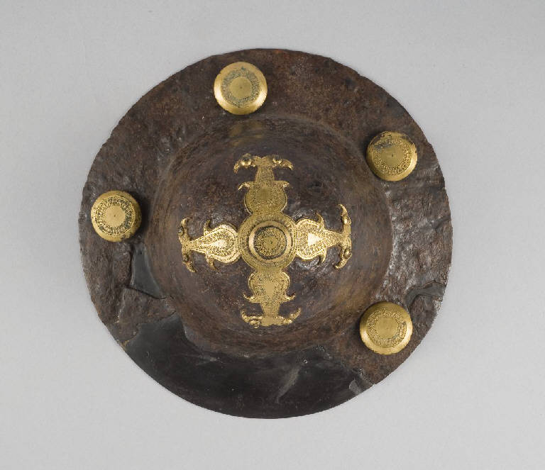 Umbone formato da una calotta emisferica pronunciata, da una parte intermedia a\ntronco di cono, piuttosto alta, e da una tesa larga su cui sono inserite quattro borchie. Alla sommità dell'umbone vi è una decorazione cruciforme in rame dorato\ncon bottone centrale e quattro bracci a goccia con terminazione finale doppia a becco d'uccello. Sulla superficie delle borchie e della decorazione cruciforme è realizzato un motivo puntinato che delinea sulle prime un cerchio e sul secondo un contorno delle forme degli elementi su cui è realizzato.