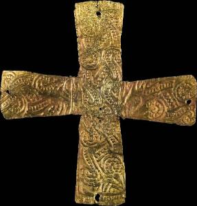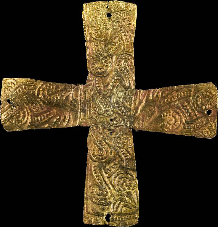 Croce a bracci svasati, decorati con intreccio di nastri perlinati. Alle estremità dei bracci, in posizione mediana, si notano i forellini per l'applicazione al tessuto.