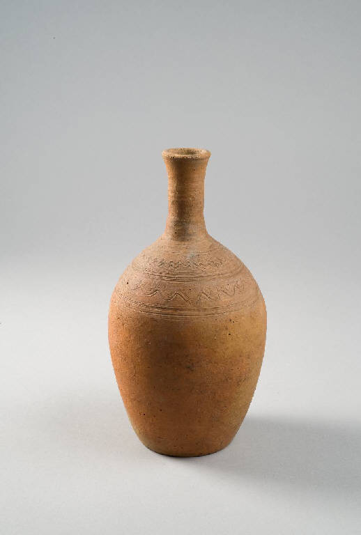 Bottiglia ad alto collo cilindrico e orlo ingrossato esoverso; corpo ovoidale decorato sulla spalla da due fasce di linee ondulate separate da scanalature parallele. Fondo piatto con cinque incavi irregolari.