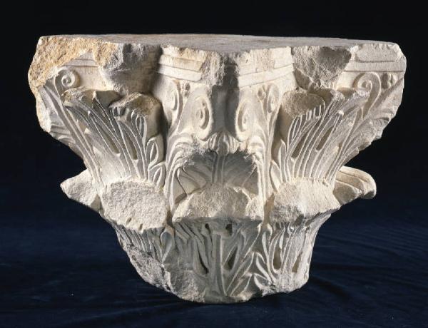 Il capitello presenta una duplice corona di foglie frastagliate che rivestono il kalathos dall'accentuata svasatura. Elici e volute ben sviluppate mostrano un profilo a V concavo. Numerose le zone d'ombra che si creano tra le punte delle foglie, con occhielli a goccia o geometrici. L'abaco presenta un doppio listello e il fiore dell'abaco è sostituito da un elemento liscio.