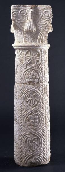 La colonnina è ricoperta di rilievi e divisa in quattro fasce verticali da grossi cordoni a torciglione posti in corrispondenza dei quattro spigoli del capitello. In ogni fascia è un tralcio a due capi che sale sinuoso fino al collarino, formando girali aperti in cui sono iscritti alternativamente foglie di vite e grappoli d'uva ad acini staccati e pendenti: nell'ansa tra girale e girale, piccole foglie lanceolate a due capi e riccioli. In una fascia, probabilmente quella frontale in origine, l'ultimo girale racchiude una stella a sei punte. Un regolare collarino a due listelli decrescenti collega la colonnina lunghe fogliette incavate: l'inferiore è inclinato con un fianco