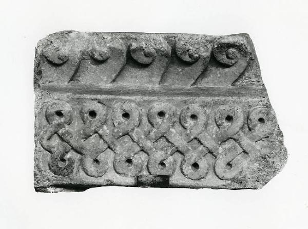Frammento di incorniciatura di una lastra più ampia. La decorazione in alto consta di volute rivolte verso sinistra e sotto in una fascia con motivo ad incrocio formante occhielli in alto e in basso.