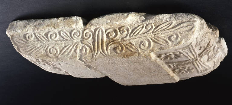 Imposta frammentaria costituita da sei elementi. I quattro lati sono dominati da una croce equilatera a doppio profilo e bottoncino centrale all'incrocio dei bracci; i maggiori ospitano un motivo vegetale che si sviluppa simmetricamente a partire da un cespo centrale.