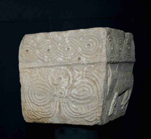 Capitello di pilastro probabilmente angolare in quanto è lavorato su due lati contigui; è a forma di cubo, leggermente rastremato in basso e con i due lati decorati divisi in due parti delle quali la superiore tiene quasi il luogo di pulvino più che di abaco. Sul lato maggiore la decorazione presenta un bue (?) visto di fianco e andante verso sinistra, ma con la testa rivoltata, probabilmente, tra ramoscelli di palma (in numero di tre) nella parte inferiore; in quella superiore è una matassa orizzontale a tre capi con fori centrali. Il lato minore presenta, in alto, identica matassa, mentre in basso è un elemento floreale sinuoso a tre petali, con rosetta centrale perforata