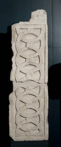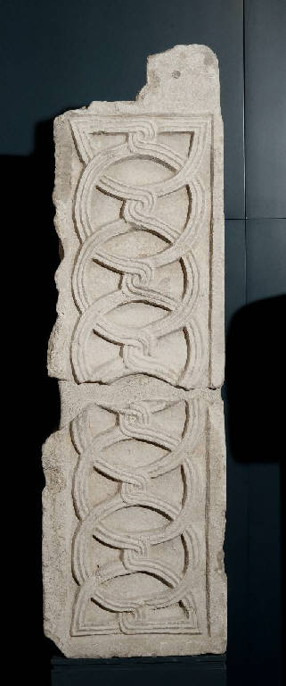Pilastrino a forma di parallelepipedo rettangolare con destinazione per sostegno di pluteo. Presenta su un fianco la scanalatura per l'inserimento di lastra marmorea. Su una delle facce la decorazione si svolge entro una superficie rettangolare delimitata da listelli marginali lisci su tre lati di cm 3 di altezza, che sul quarto lato si amplia per l'altezza di circa cm 12, mostrando come questo pezzo fosse la base del pilastrino. Lo schema decorativo è semplice e assai comune, formato da due serie sovrapposte di anelli a tre capi viminei intrecciati l'uno sull'altro, distanziati di mezzi semicerchi
