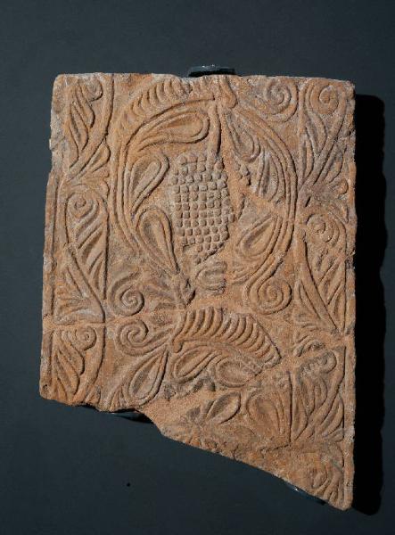 Frammento di cornice decorativa in cotto probabilmente con collocazione verticale. Tra due esili listelli laterali si sviluppa il tema centrale a tralcio di vite a cornucopia, compreso tra due fascette di palmette continue. Il tralcio, a due capi viminei, forma volute terminanti con grappoli o fiori a otto petali. \nImpianto compositivo ed esecuzione risultano di buona qualità e regolari.