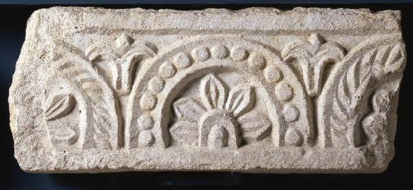 Frammento di cornice orizzontale, con archetti decorati da perline o\nun motivo a corda. Negli archetti, intervallati da calici vegetali, sono presenti motivi fogliacei a palmetta o a fiore.