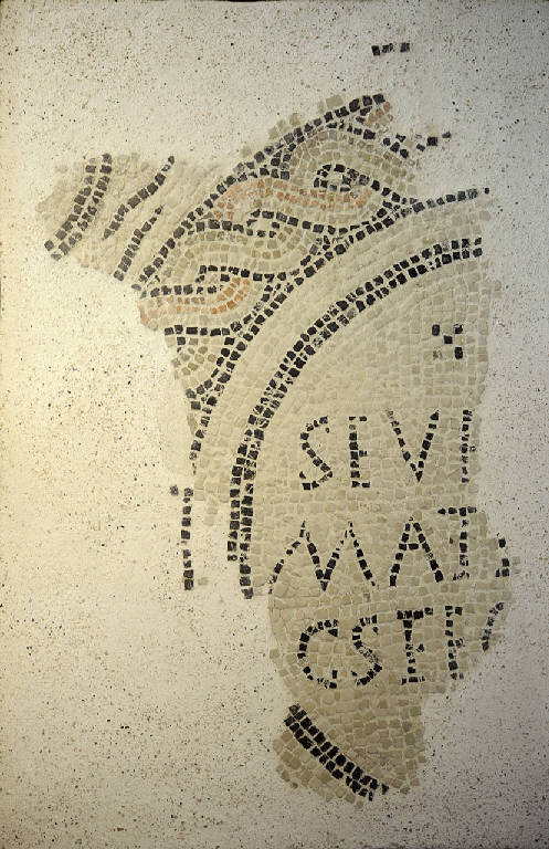 Tessellato policromo su fondo bianco, con tessere di medie dimensioni in calcare bianco, nero e calcari colorati verdi e rosa. Si riconosce parte di un disco centrale bordato da una doppia fila di tessere nero; seguono tre file concentriche di tessere bianche, una treccia a due capi policromi con profilo nero. Sul margine sinistro si conserva solo una minima porzione di una decorazione forse a vegetale. All'interno del disco centrale un'iscrizione e sopra una crocetta composta da cinque tessere nere.