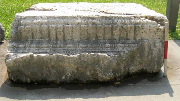 Il blocco presenta superficie di anatirosi sul piano di posa, dove si osserva un foro per grappa lungo 20 cm, largo 7,5 cm e prof. 7. La cornice si articola in una sima non conservata a cui segue una gola concava alta 1 cm, un astragalo a coppie di perline e fusarole (lunghe 3,5), fascia di dentelli (alt. 8 cm, larg. 3,5 cm) e una gola rovescia alta 5 cm.\nL'anomala presenza del foro per grappa sul piano di posa potrebbe forse indicare un riutilizzo del blocco.